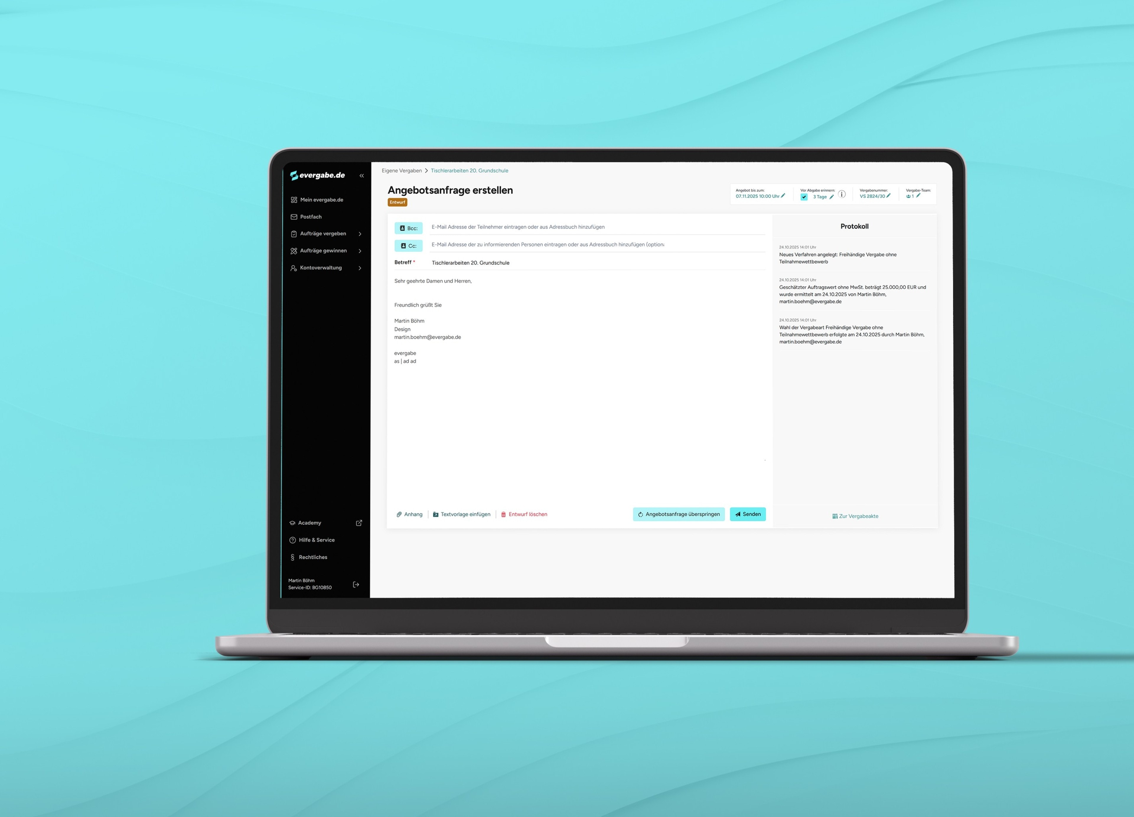 Rechtssicher. Vollständig. Digital.Setze auf die Flexible Auftragsvergabe: Mit evergabe.de führst Du beschränkte Verfahren ohne Teilnahmewettbewerb sowie Direktaufträge einfach und schnell durch. Die ideale Ergänzung zu bestehenden Vergabemanagementsystemen.